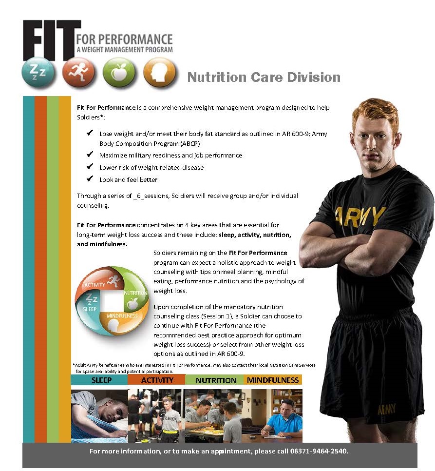 The Nutrition Care Services office of the U.S. Army Medical Department Activity Bavaria strives to provide Service Member support and patient care through nutrition expertise utilizing the full spectrum of nutrition science to optimize individual health, physical performance, and a nutritional education and awareness that shapes eating habits for a lifetime.