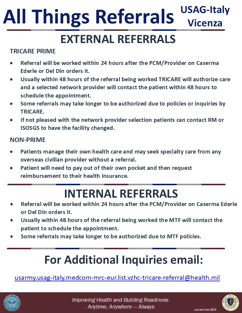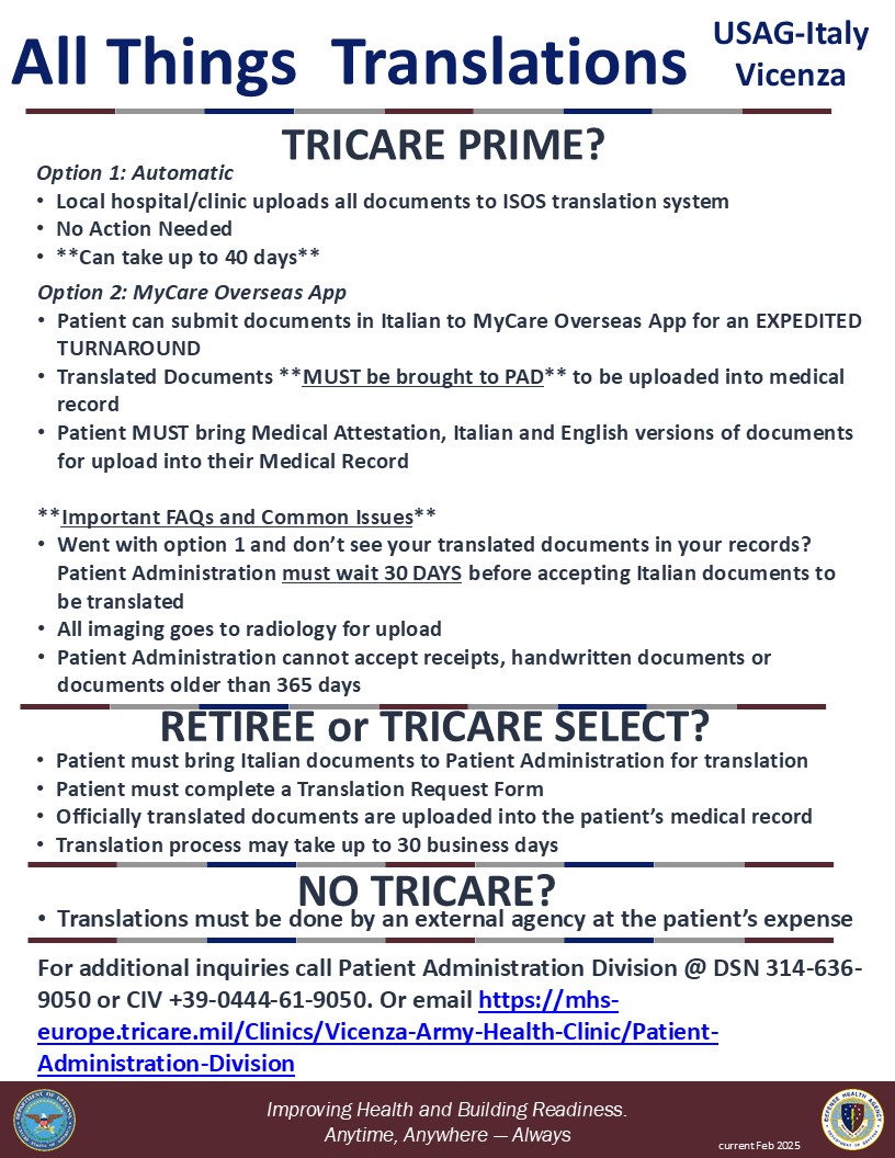 The Patient Administration Division provides quality healthcare administrative service support to the Soldiers, Family Members and DoD-eligible beneficiaries of the U.S. Army Garrison Italy community and surrounding areas.