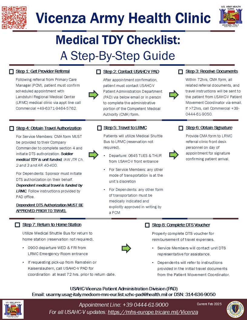 The medical shuttle is available for patients with a referral to Landstuhl Regional Medical Center and/or adjacent facilities within Germany. Patients must see the Patient Administration Division (PAD) to coordinate travel and receive the completed Competent Medical Authority (CMA) packet discussed above.