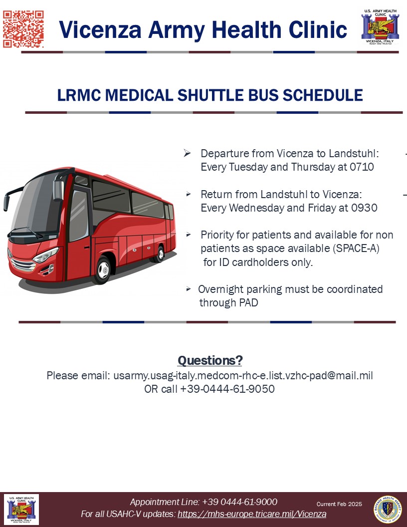 The medical shuttle departs Vicenza to Germany with stops at Ramstein, and LRMC every Tuesday and Thursday. The pickup time is 0645 hours at the Health Clinic parking lot with the bus leaving promptly at 0710 hours.