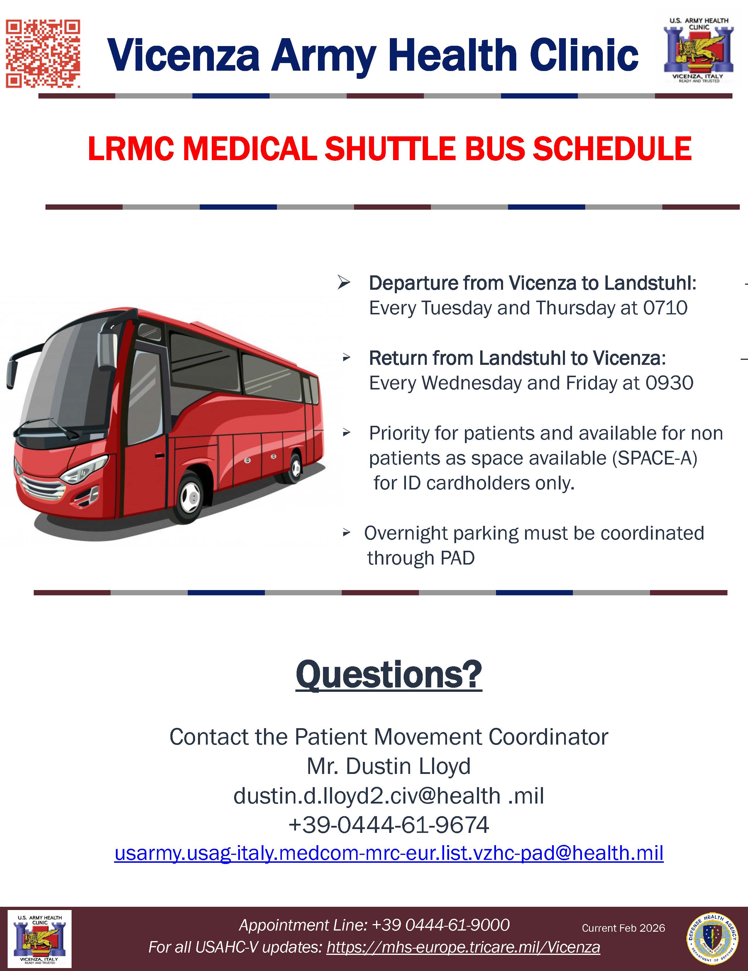 The medical shuttle is available for patients with a referral to Landstuhl Regional Medical Center and/or adjacent facilities within Germany. Patients must see the Patient Movement Coordinator to coordinate travel and receive the completed Competent Medical Authority (CMA) packet if applicable.